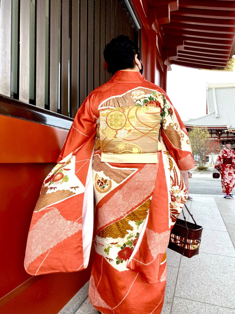 comment : Hello! I wore this furisode when I went to a temple. It was a bit windy, and I think that the wind highlighted the swinging movement of the furisode sleeves in this picture :)