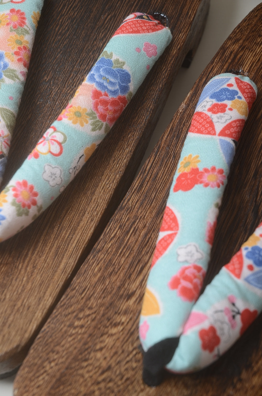 | Geta sandals are made from wood with rubber soles and the sandal thongs are made from remnants of kimono fabric. Sandals have a tighter fit compared to normal sandals, so please read the page "Measuring Tips" to choose the correct size. | |