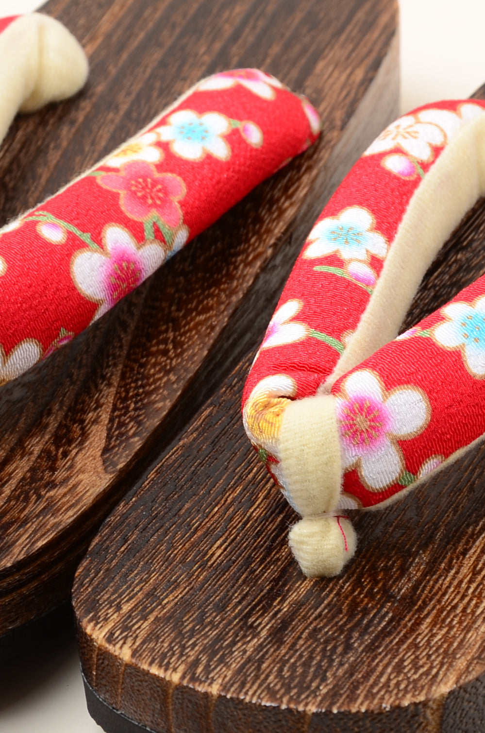 Geta sandals are made from wood with rubber soles and the sandal thongs are made from remnants of kimono fabric. Sandals have a tighter fit compared to normal sandals, so please read the page "Measuring Tips" to choose the correct size.