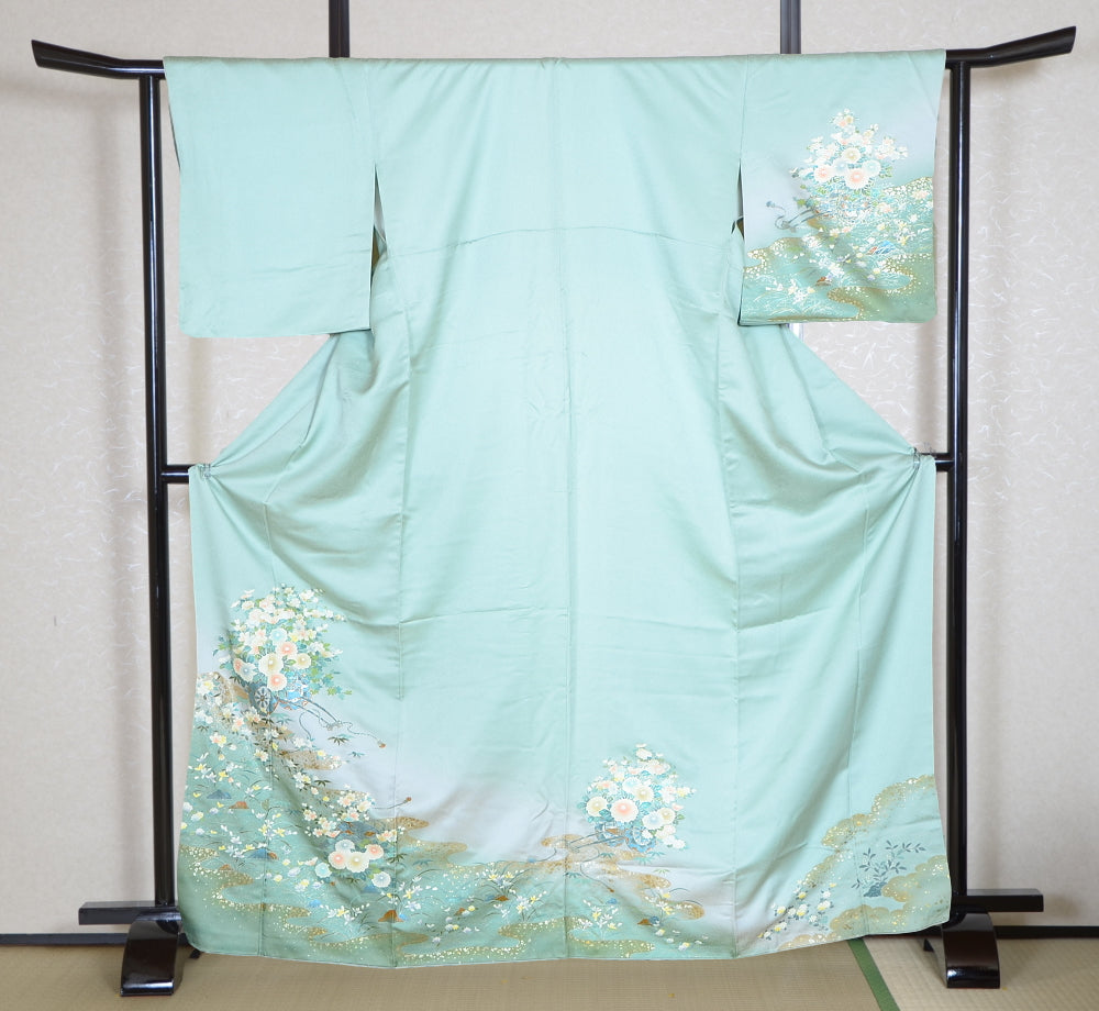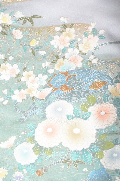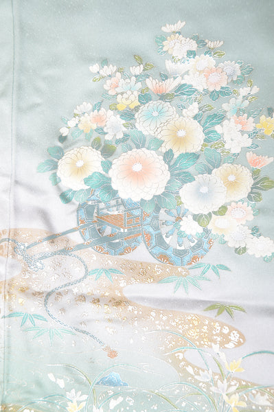 | This item is from a kimono auction where only a limited number of professional kimono buyers can participate. It is a one of a kind. Traditional kimono is likened to "wearable art" since dozens of artisans' techniques are used in one kimono. These traditional techniques and designs are breathtakingly beautiful and it is hard to find words to describe them. | |