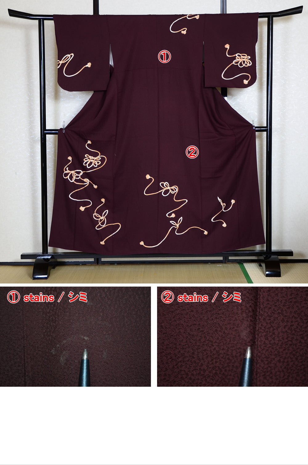 | Very good condition of all the used kimono. We can see a little signs of wear. There are small stains on it but not mind too much. You can wear it. | |
