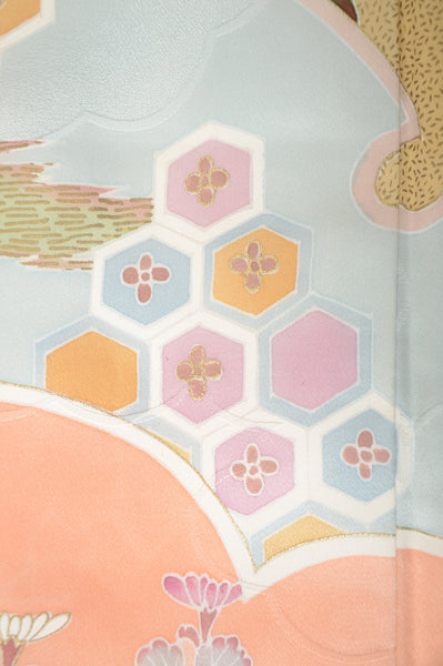 | This item is from a kimono auction where only a limited number of professional kimono buyers can participate. It is a one of a kind. Traditional kimono is likened to "wearable art" since dozens of artisans' techniques are used in one kimono. These traditional techniques and designs are breathtakingly beautiful and it is hard to find words to describe them. | |