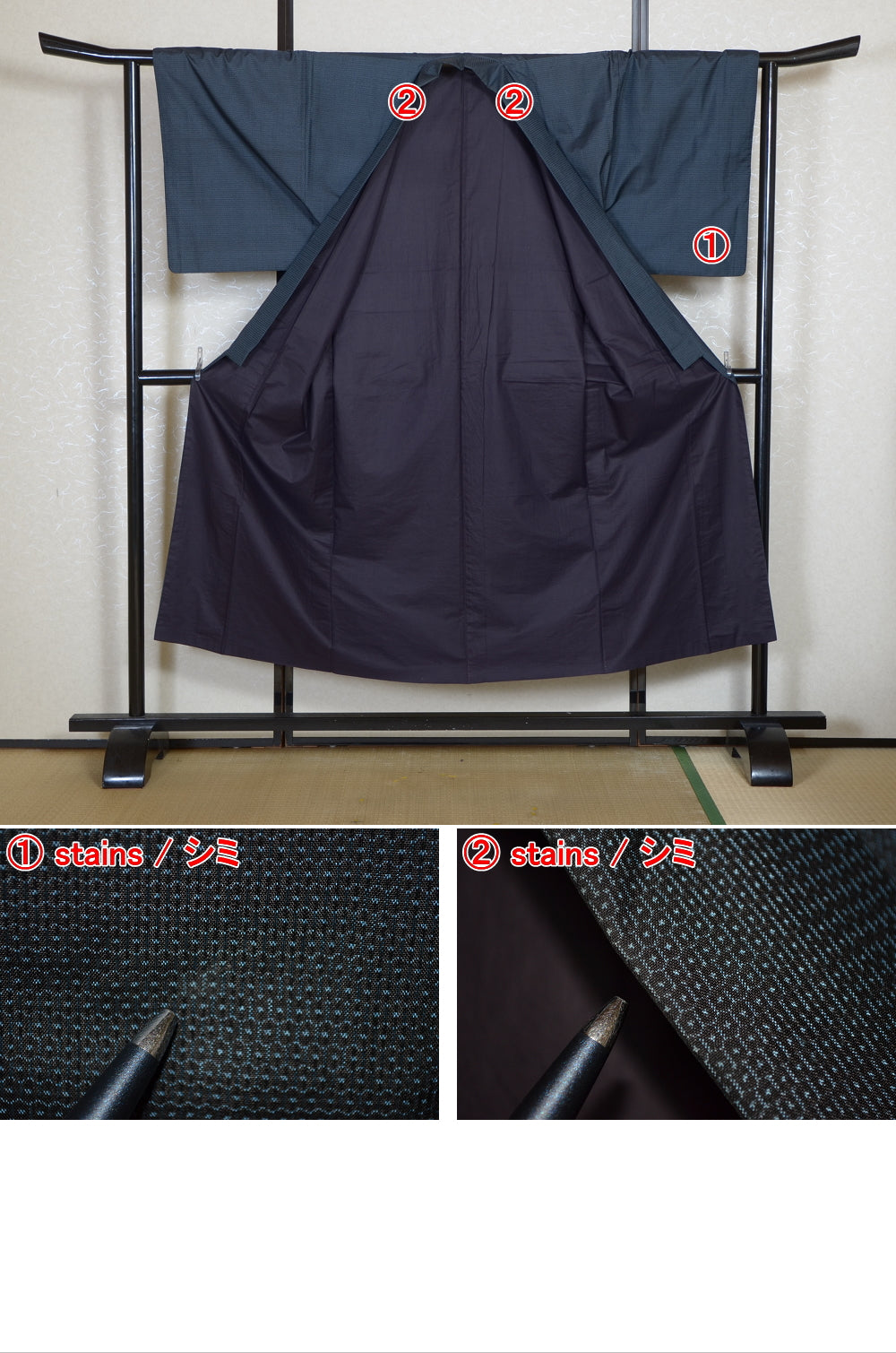 | Very good condition of all the used kimono. We can see a little signs of wear. There are small stains on it but not mind too much. You can wear it. | |
