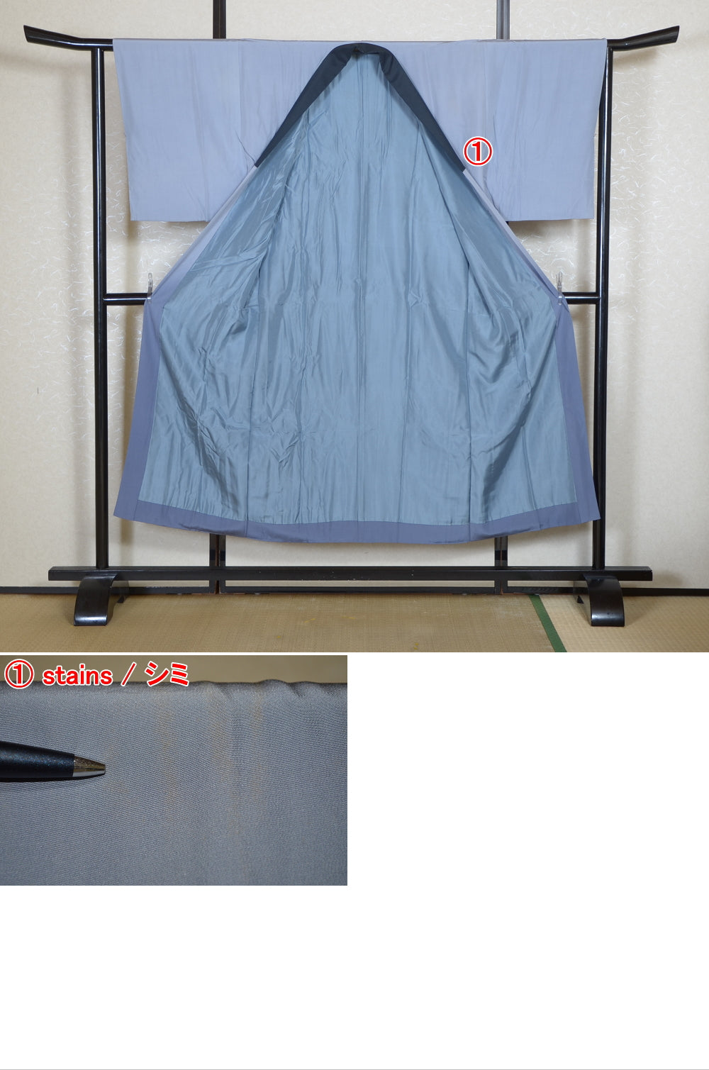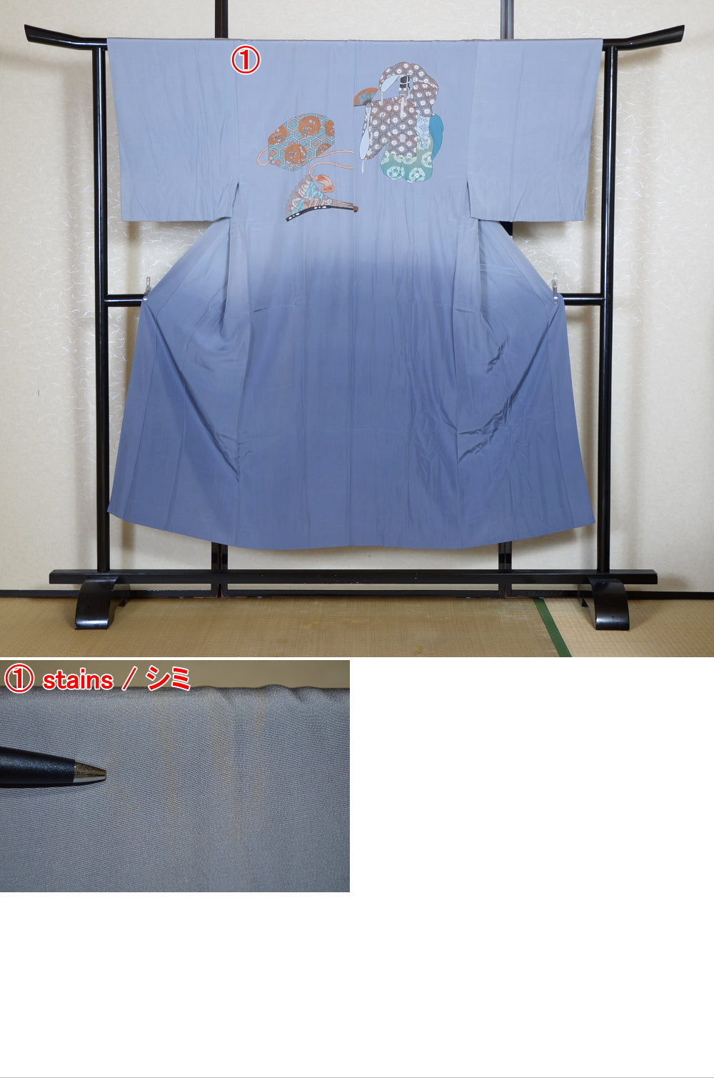 Very good condition of all the used kimono. We can see a little signs of wear. There are small stains on it but not mind too much. You can wear it.