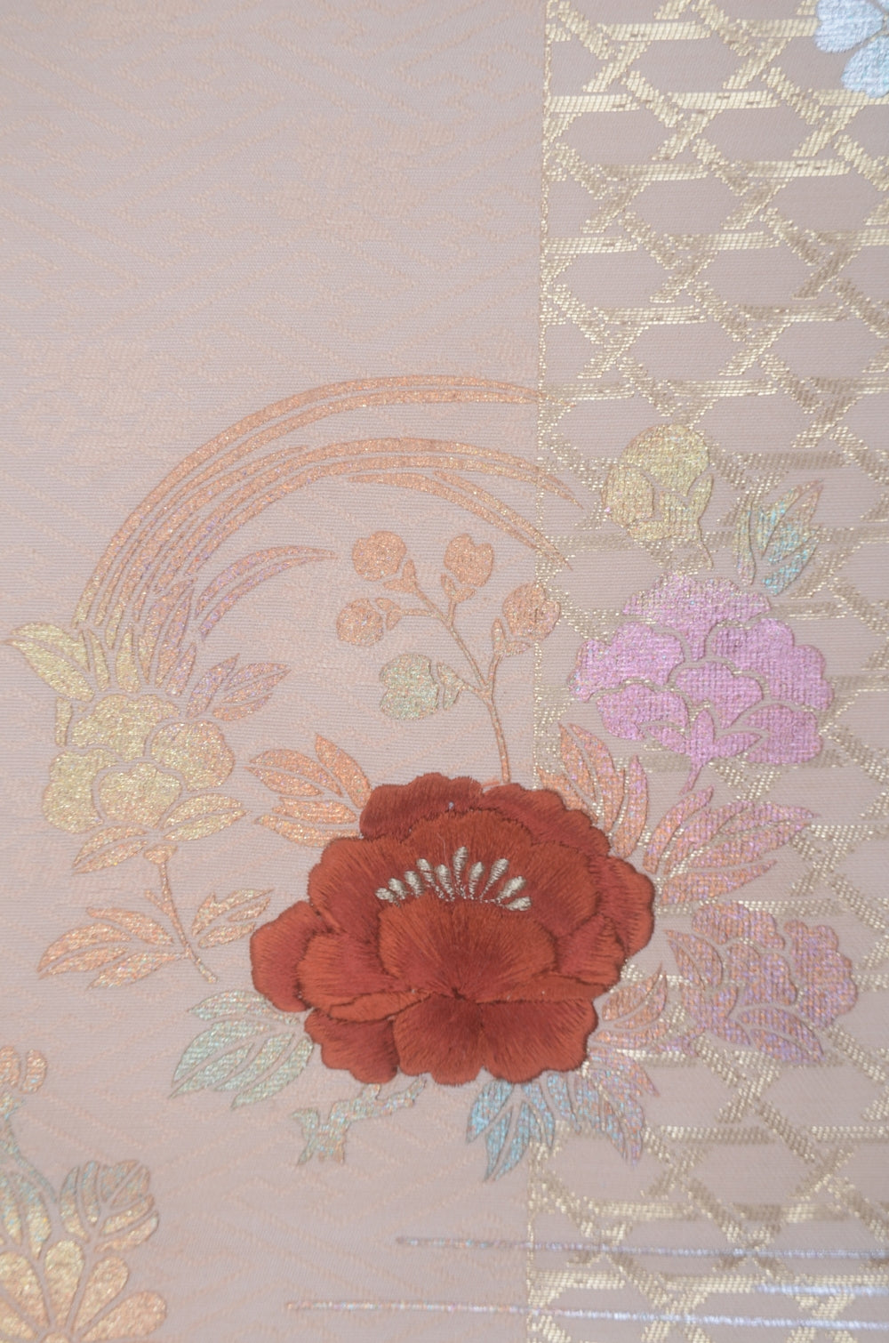 | Traditional kimono obi belts are decorated with gorgeous and artistic designs all over. This obi is a Nagoya obi. Please tie the taiko knot. |