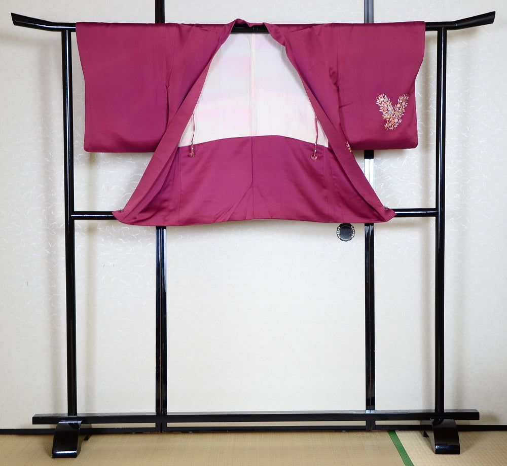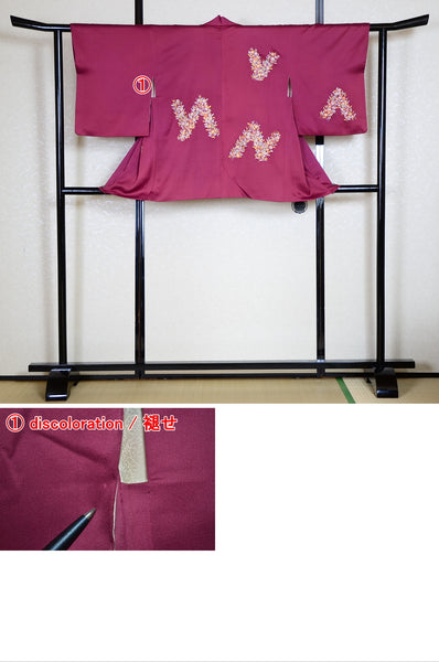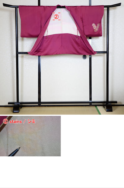 Very good condition of all the used kimono. We can see a little signs of wear. There are small stains on it but not mind too much. You can wear it.