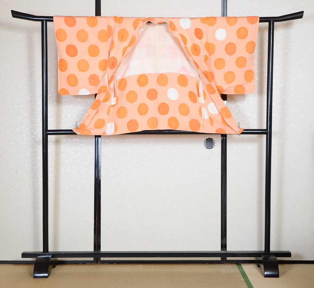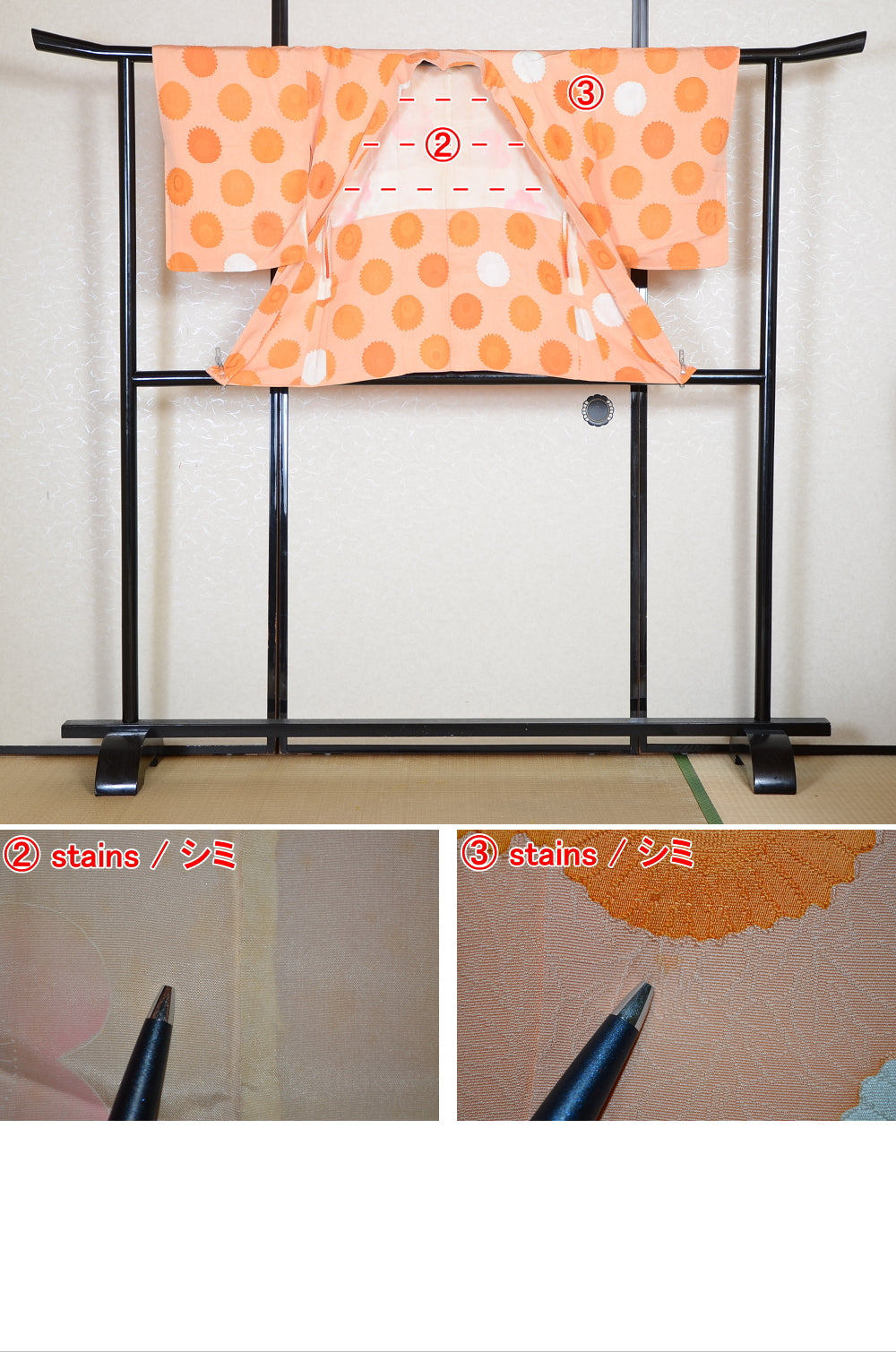 Very good condition of all the used kimono. We can see a little signs of wear. There are small stains on it but not mind too much. You can wear it.