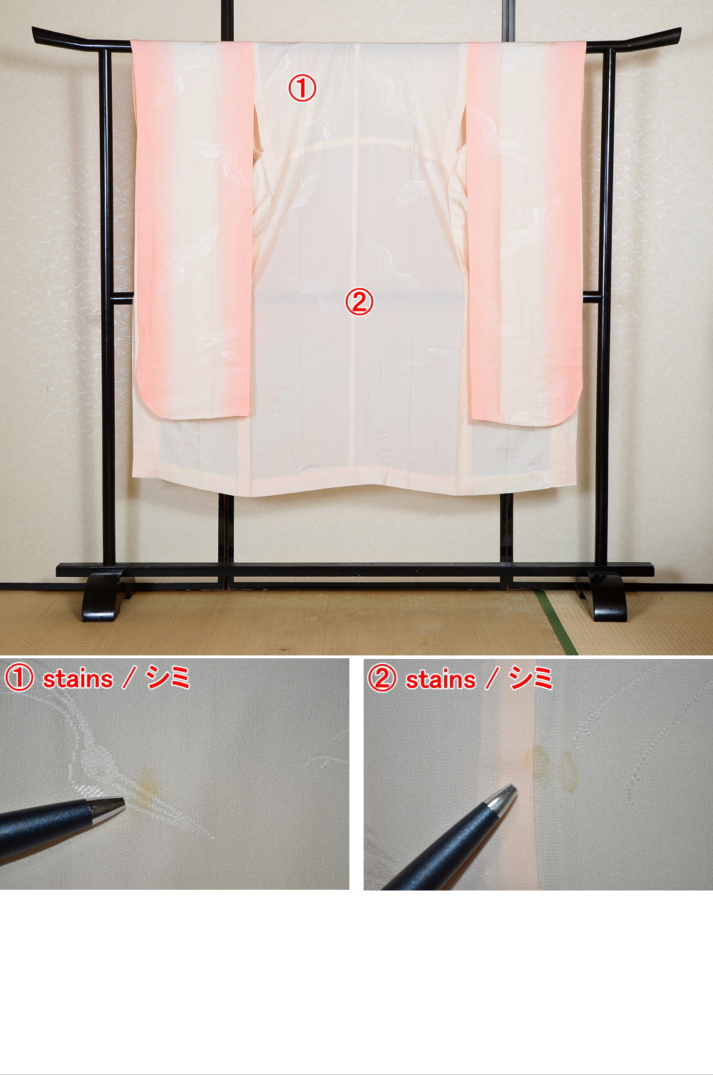 | Very good condition of all the used kimono. We can see a little signs of wear. There are small stains on it but not mind too much. You can wear it. | |