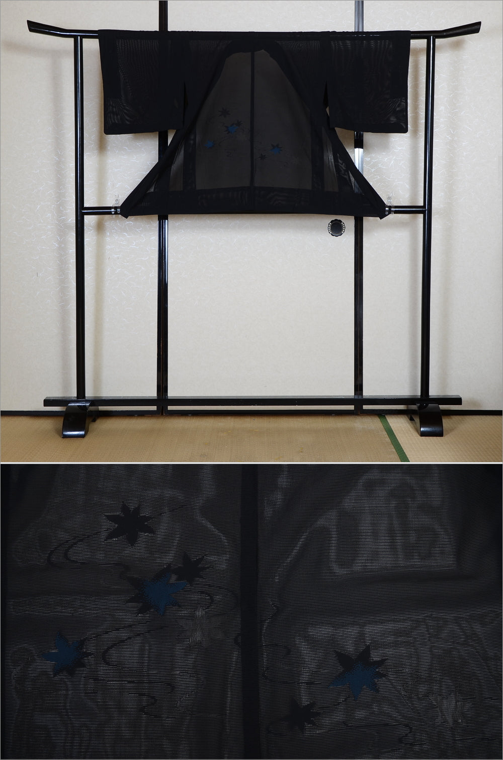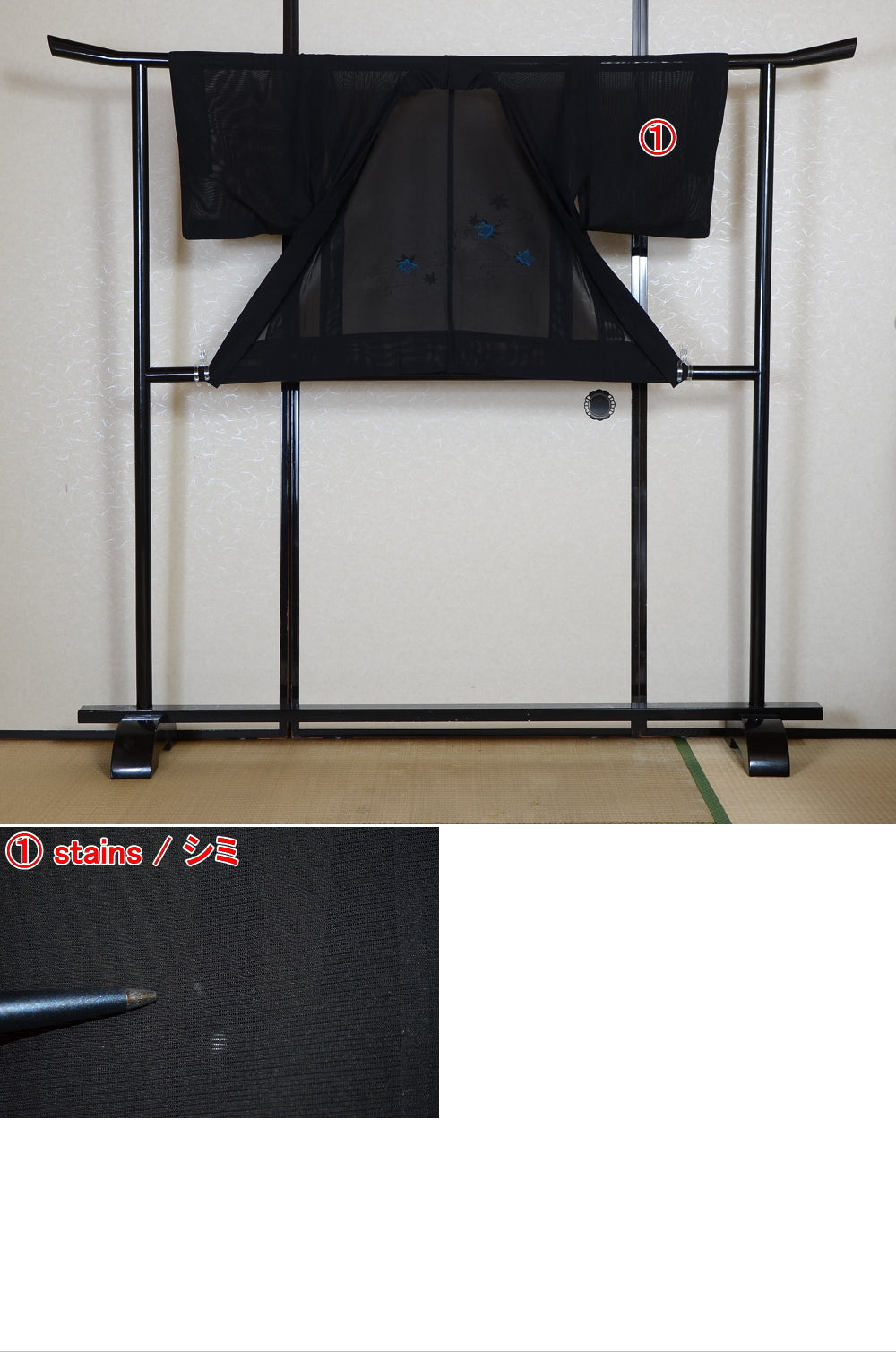 Very good condition of all the used kimono. We can see a little signs of wear. There are small stains on it but not mind too much. You can wear it.