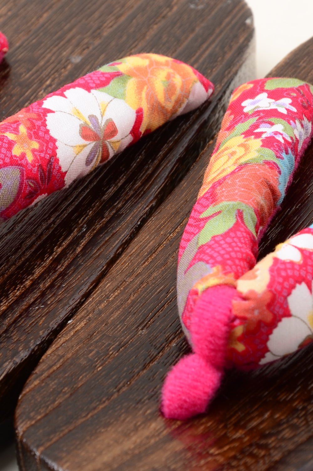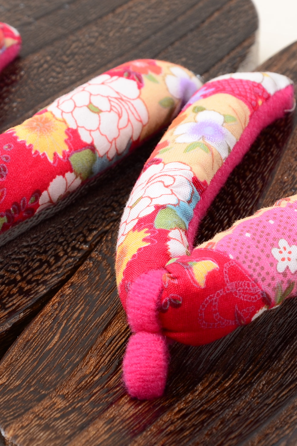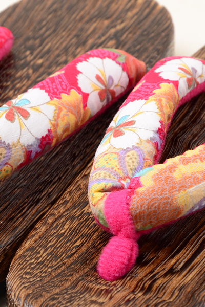 Geta sandals are made from wood with rubber soles and the sandal thongs are made from remnants of kimono fabric. Sandals have a tighter fit compared to normal sandals, so please read the page "Measuring Tips" to choose the correct size.