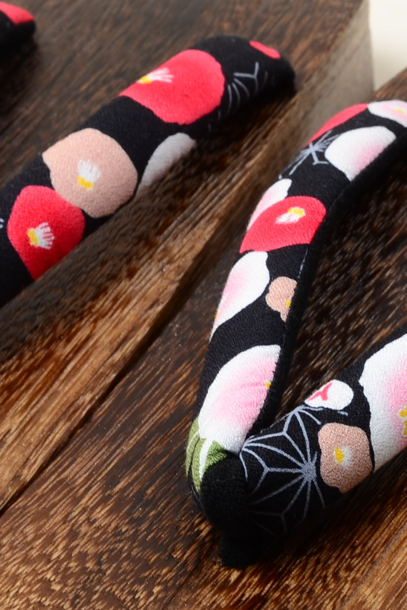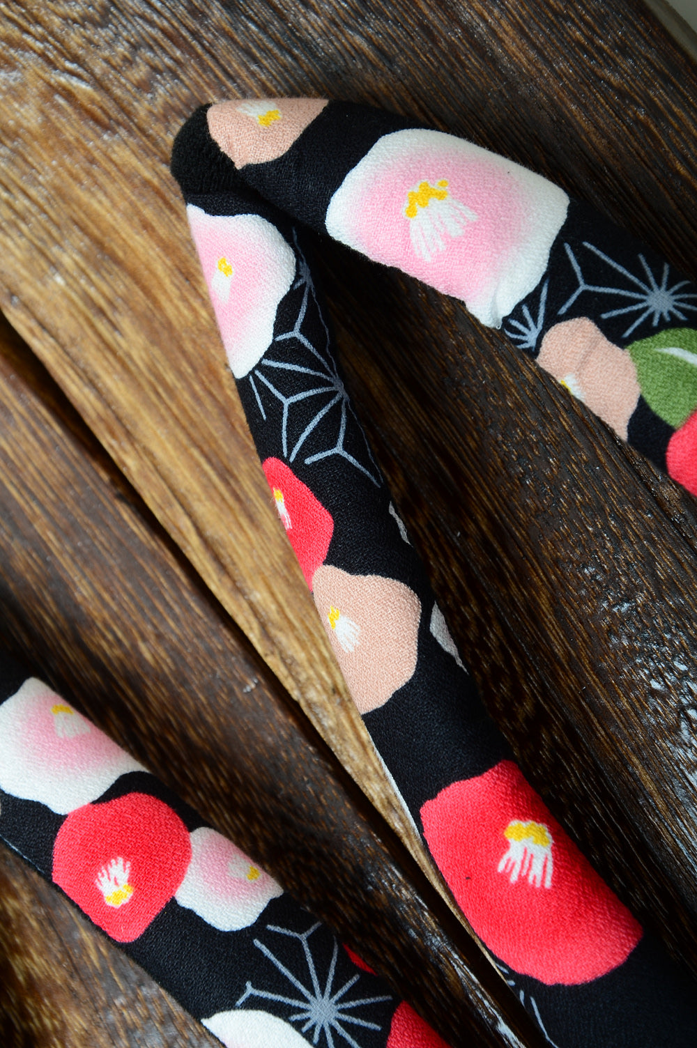 Geta sandals are made from wood with rubber soles and the sandal thongs are made from remnants of kimono fabric. Sandals have a tighter fit compared to normal sandals, so please read the page "Measuring Tips" to choose the correct size.