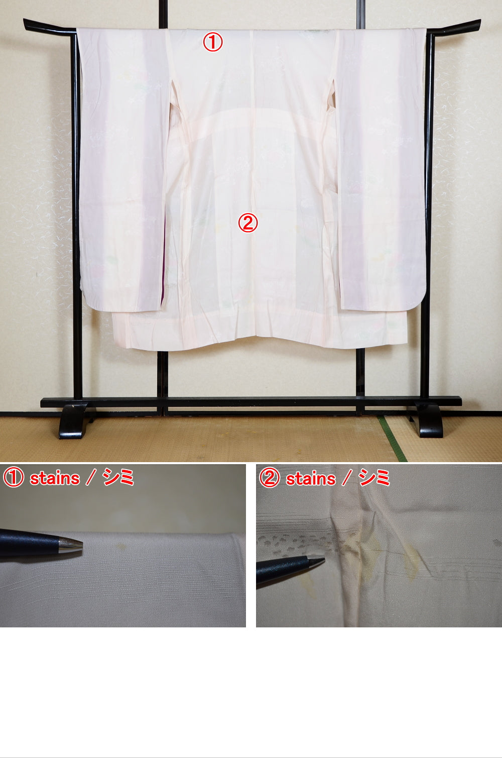 | Very good condition of all the used kimono. We can see a little signs of wear. There are small stains on it but not mind too much. You can wear it. | |