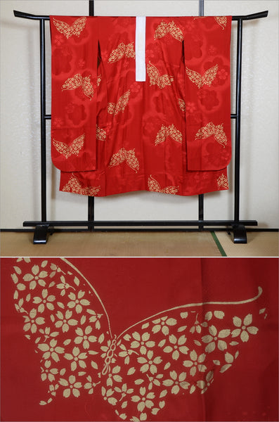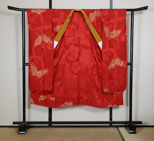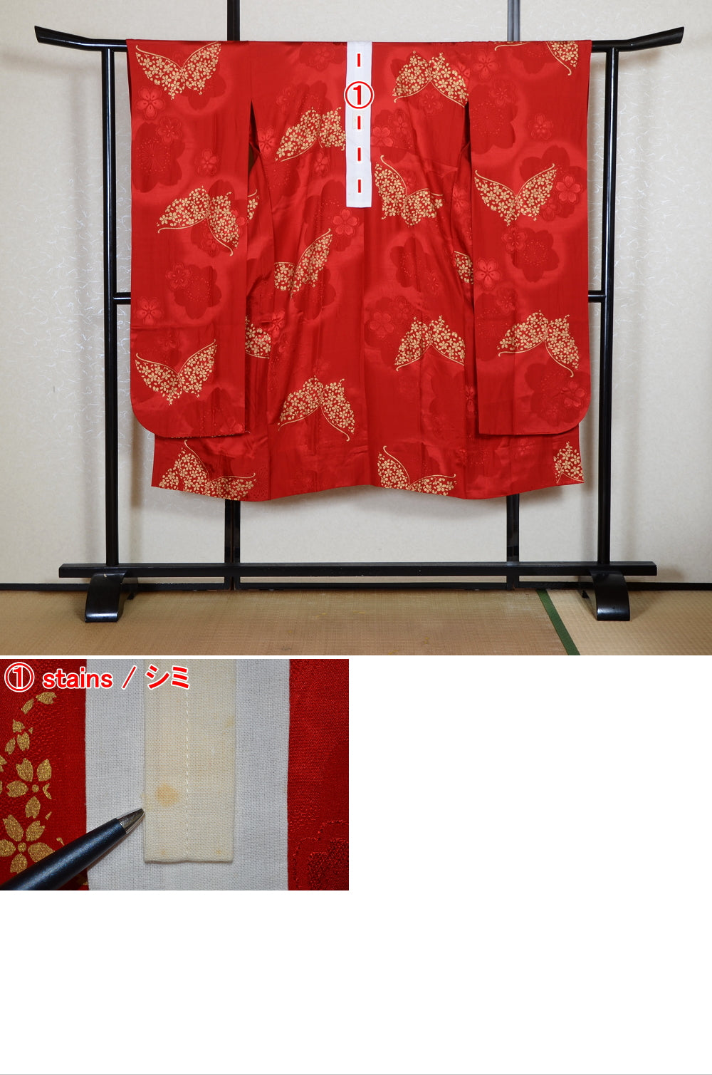 Very good condition of all the used kimono. We can see a little signs of wear. There are small stains on it but not mind too much. You can wear it.