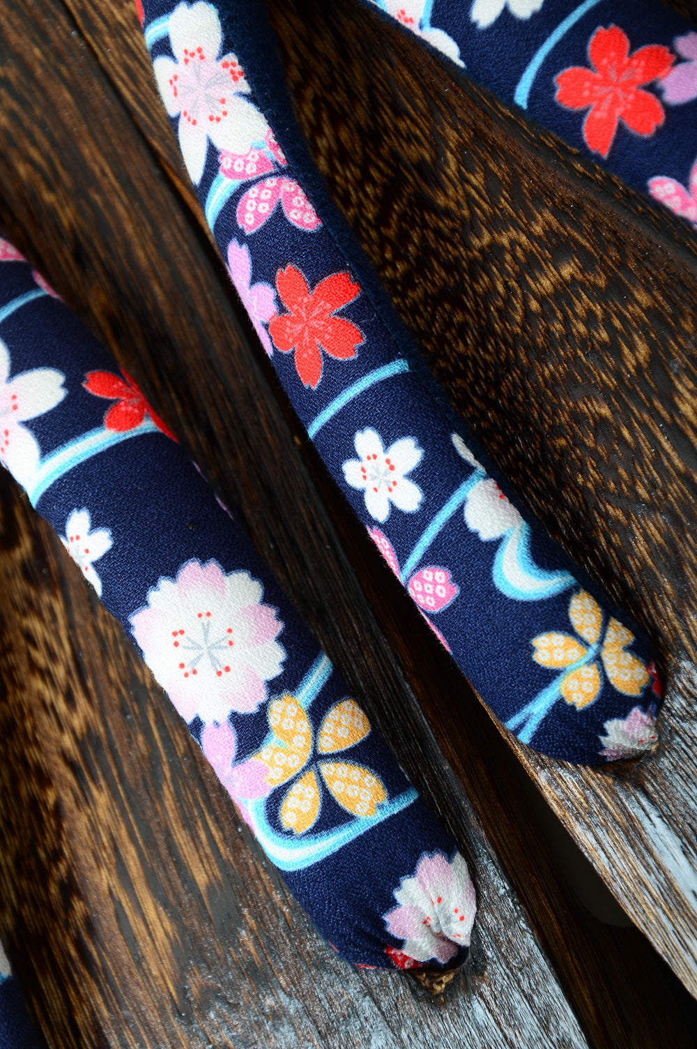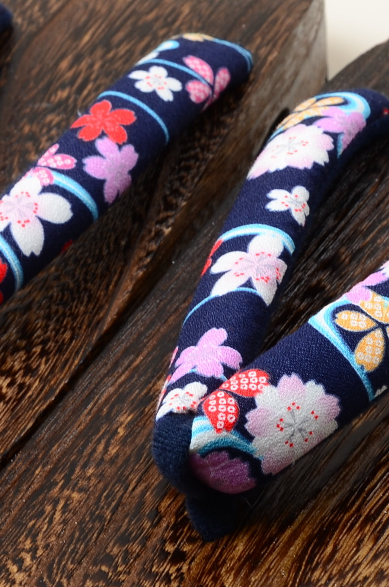 Geta sandals are made from wood with rubber soles and the sandal thongs are made from remnants of kimono fabric. Sandals have a tighter fit compared to normal sandals, so please read the page "Measuring Tips" to choose the correct size.