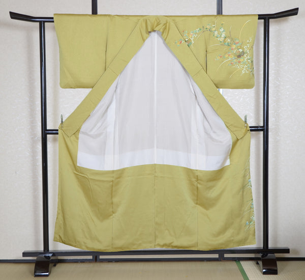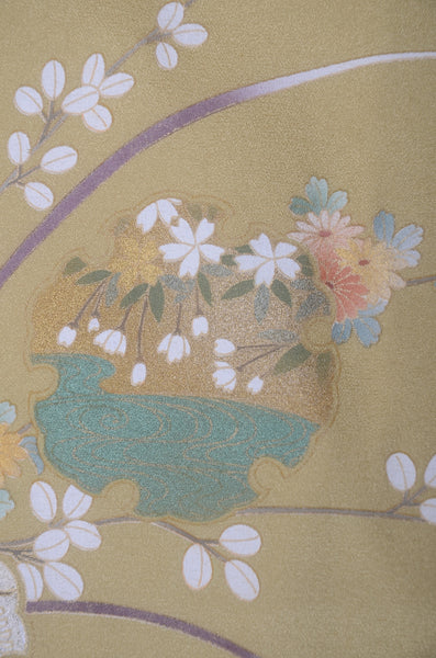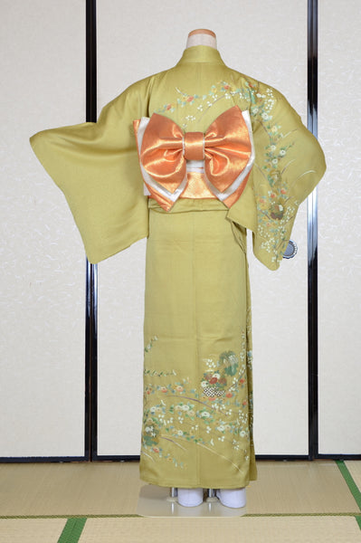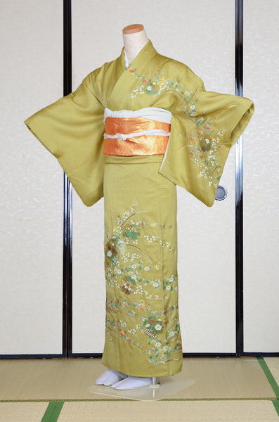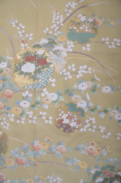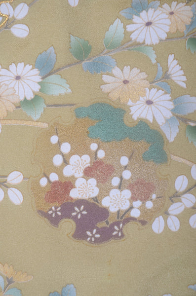 | This item is from a kimono auction where only a limited number of professional kimono buyers can participate. It is a one of a kind. Traditional kimono is likened to "wearable art" since dozens of artisans' techniques are used in one kimono. These traditional techniques and designs are breathtakingly beautiful and it is hard to find words to describe them. | ||||||||||||
